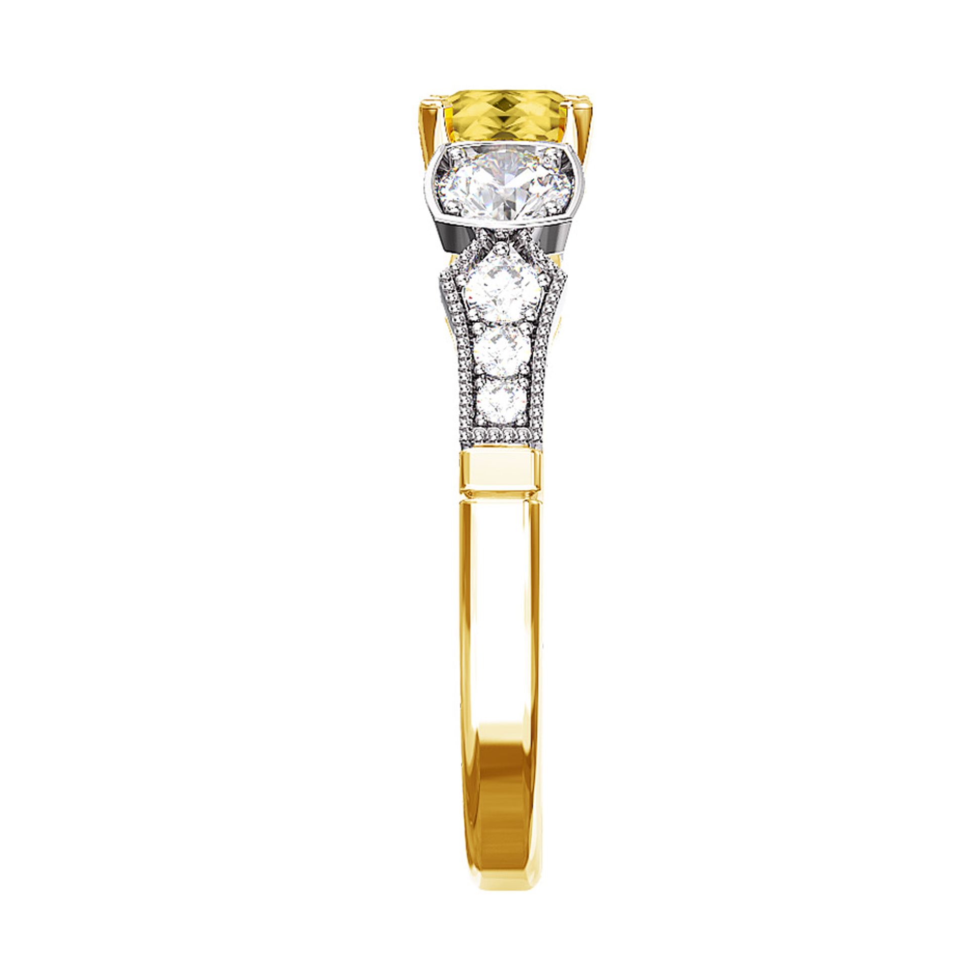A cushion cut yellow diamond ring. With two round diamonds either side in a bezel setting. The band has a custom-crafted feature of milgrain and filigree set pave diamonds in 18k white gold.
