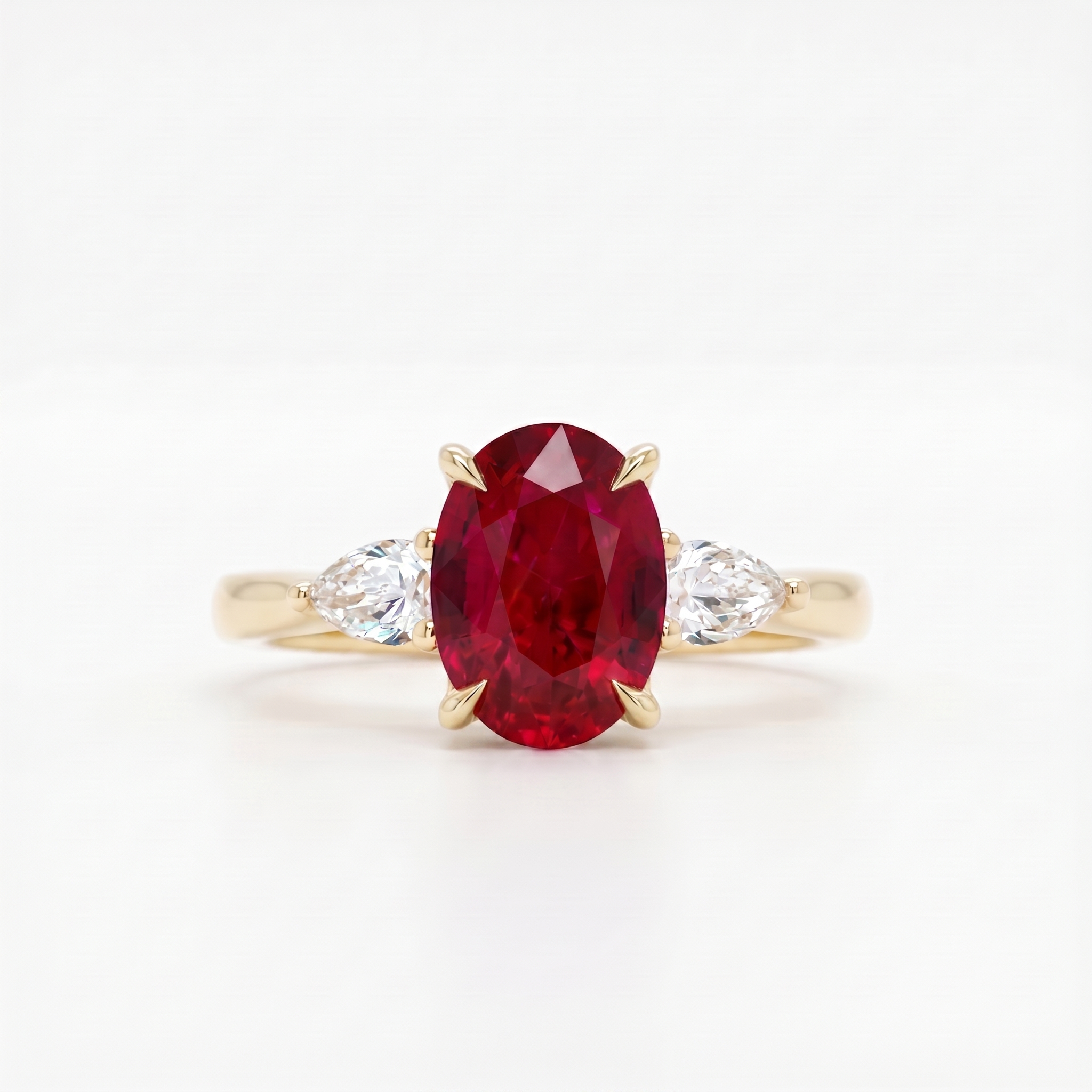 This three-stone engagement ring features a captivating 1.1-carat Burmese ruby, known for its deep, vibrant red hue. Flanked by two pear-shaped diamond side stones, the design beautifully enhances the central ruby’s brilliance. The 18k yellow gold band adds a classic warmth, making this ring a timeless symbol of love and passion. Crafted with meticulous attention to detail, this ring is perfect for those seeking a unique and luxurious engagement ring.
