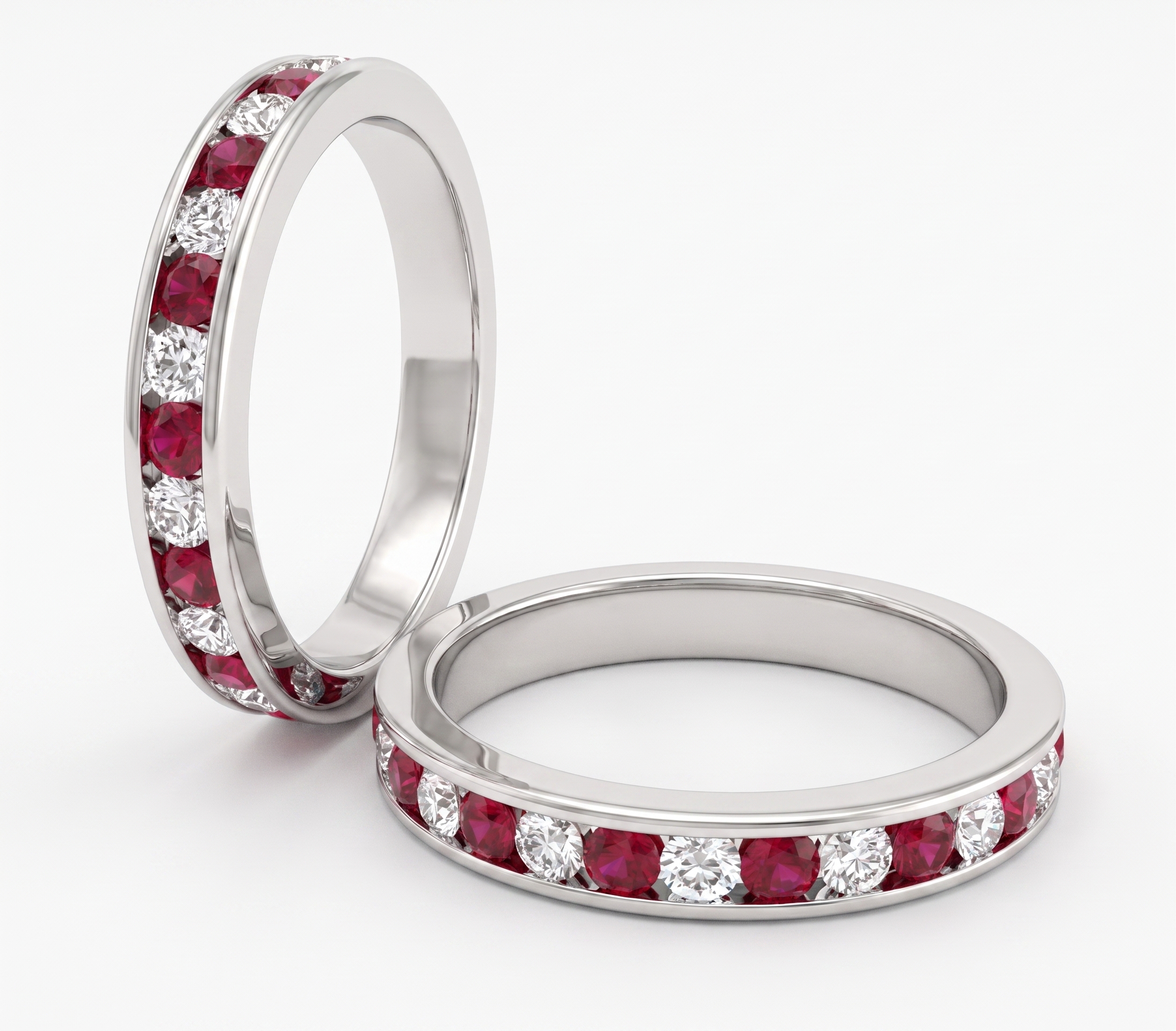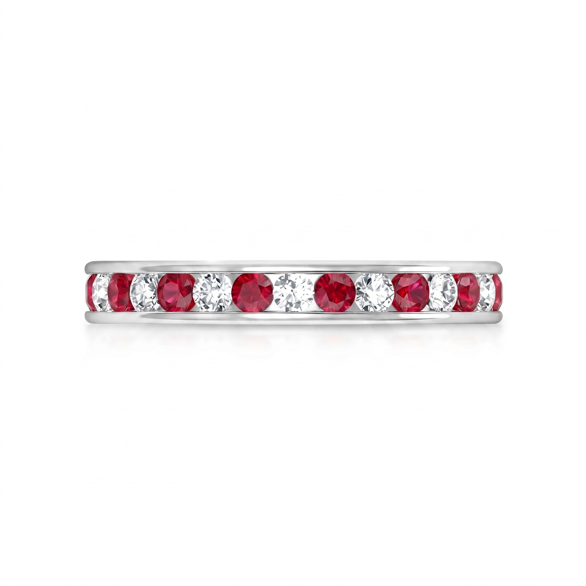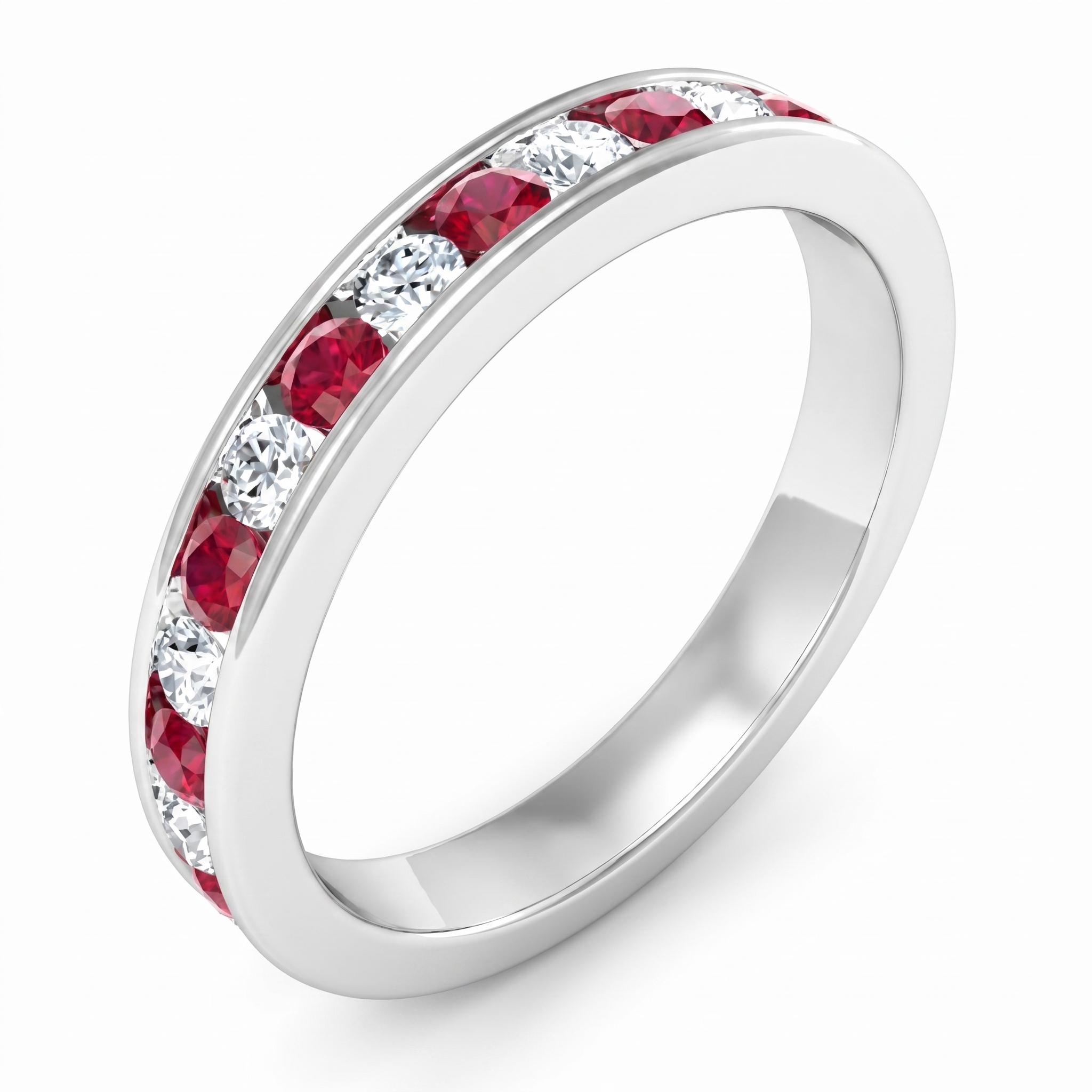 A classic channel set ring set with alternating diamonds and rubies. This design has a very delicate twist to the half band diamond eternity bands.