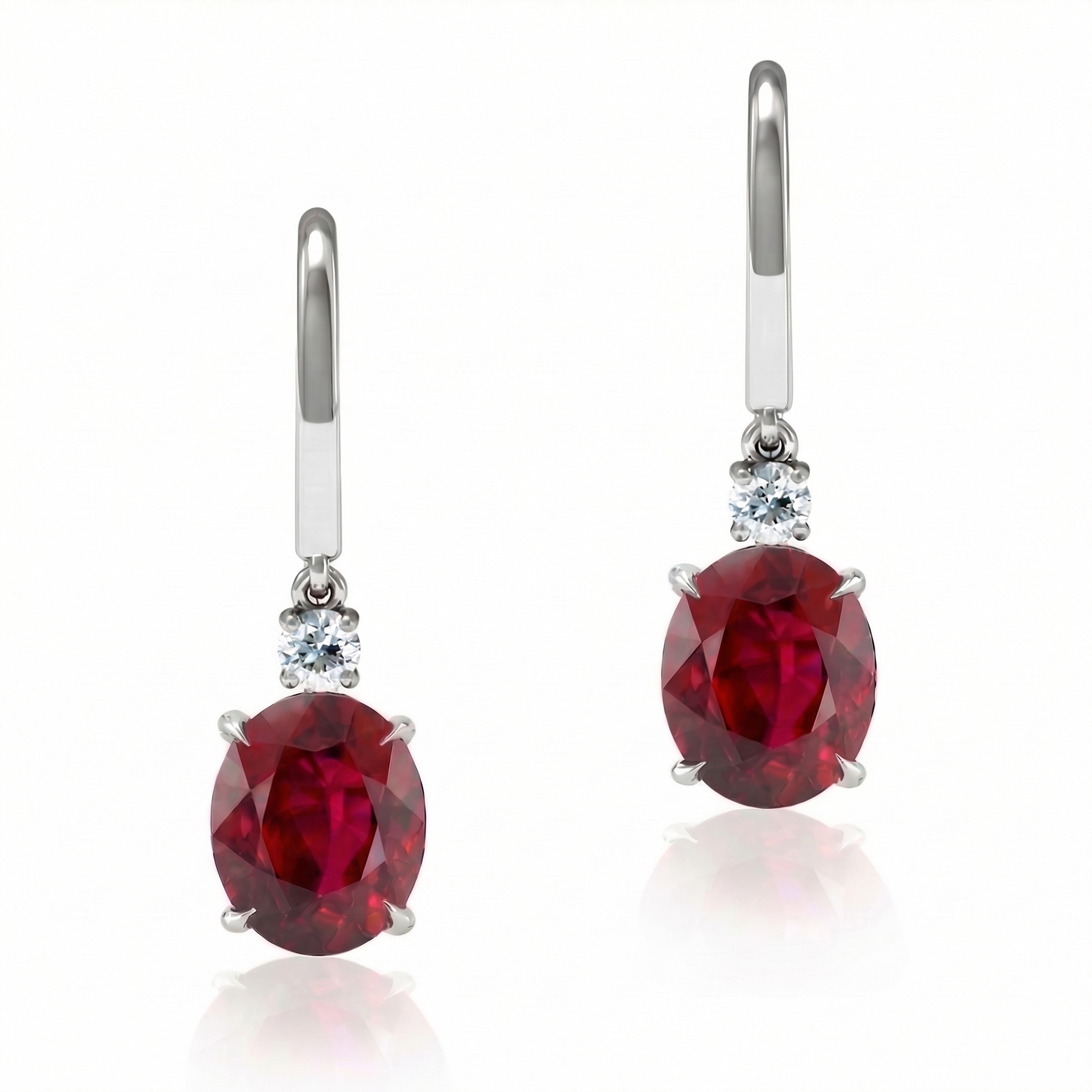 This classic pair of Oval Ruby Drop Earrings pair rich, oval-cut rubies with a single round brilliant diamond accent for a crisp sparkle. The drops are articulated for graceful movement and cradled in minimal four-prong baskets of 18K white gold that let the gemstones take center stage. A slender shepherd’s hook back sits comfortably and securely, giving these earrings an airy, elongating silhouette you can wear from desk to dinner.