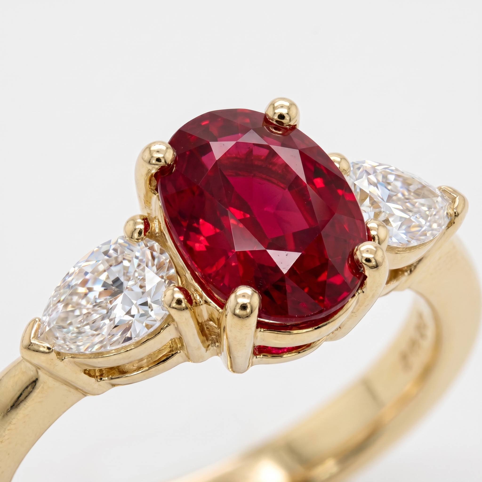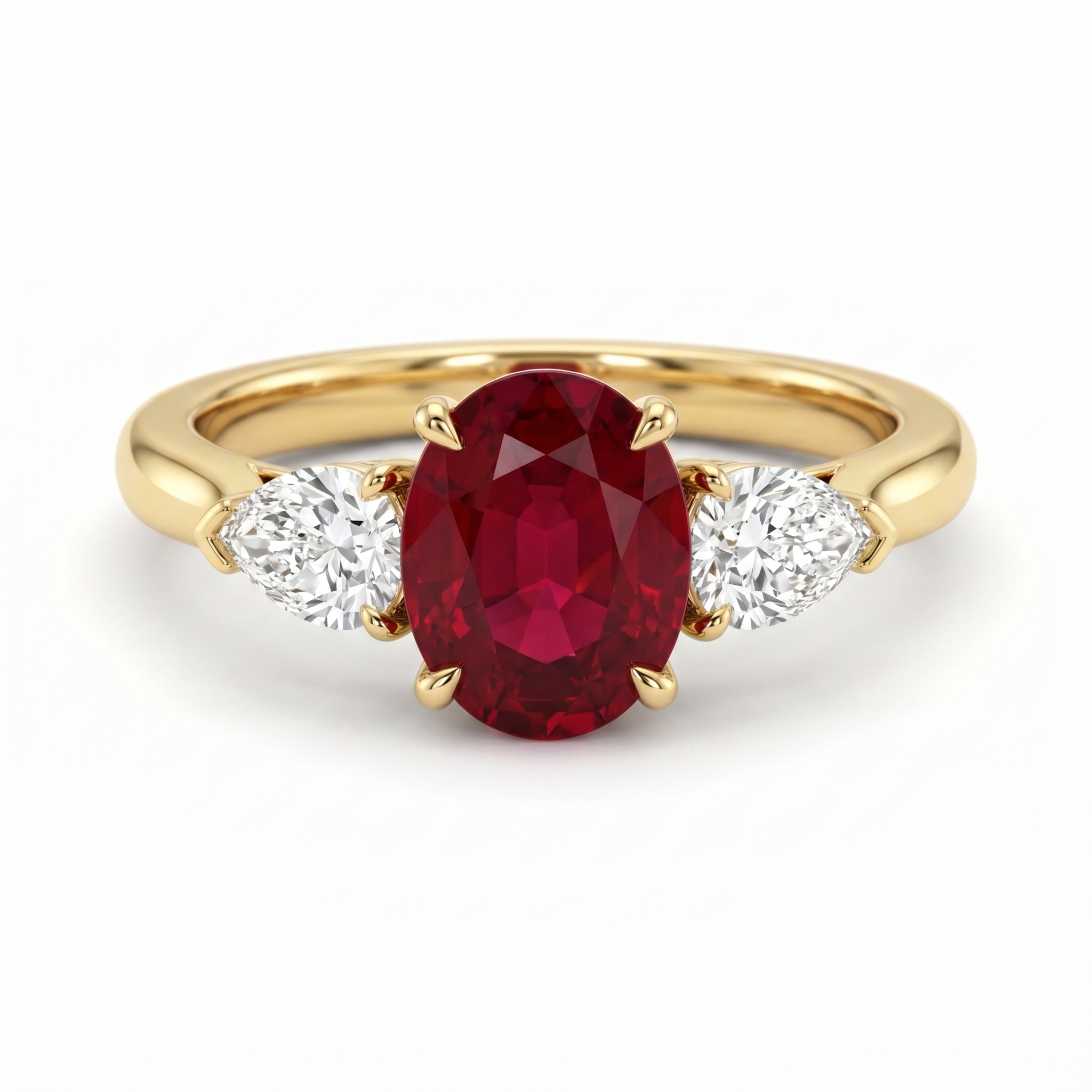 An oval cut Ruby held in a petal basket flanked by pear shaped diamonds. A four claw setting in 18k yellow gold.