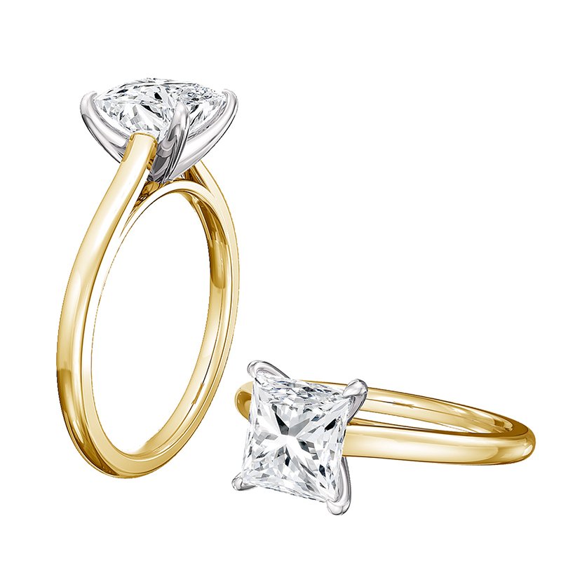 A modern-style solitaire engagement ring. Showcasing a princess cut diamond in the centre of a claw setting. Setting made from 18k White Gold to highlight the diamond. Band made from 18k Yellow Gold.